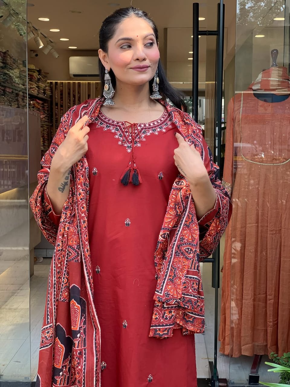 *Pure fine Cotton fabric Kurti full embroidery with Pant with cottan 60*60 Dupatta*